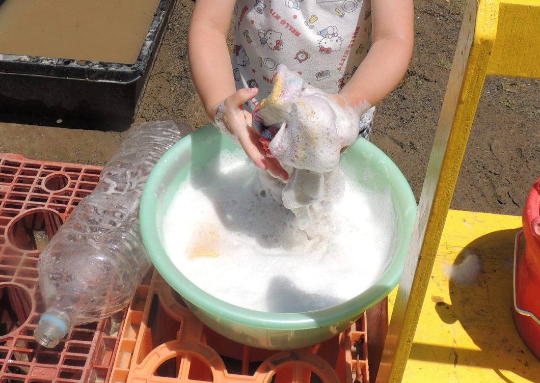 今週のはじめから、4歳児では泡を使っての洗濯ごっこを楽しむ様子があります。先日、服が泥で汚れた時に「お気に入りの服だったのに~😿」と悲しみに溢れる男の子の様子がありました。「じゃあ、一緒にお洗濯しよう!」とその時の先生と一緒に洗濯をして乾かした経験と、3歳児が泡あそびをしている様子が結びつき、はじまったようです。固形石鹸をおろし金で細かくし、水と混ぜて泡立て泡立て.。o○ タオルや服をゴシゴシ洗います。