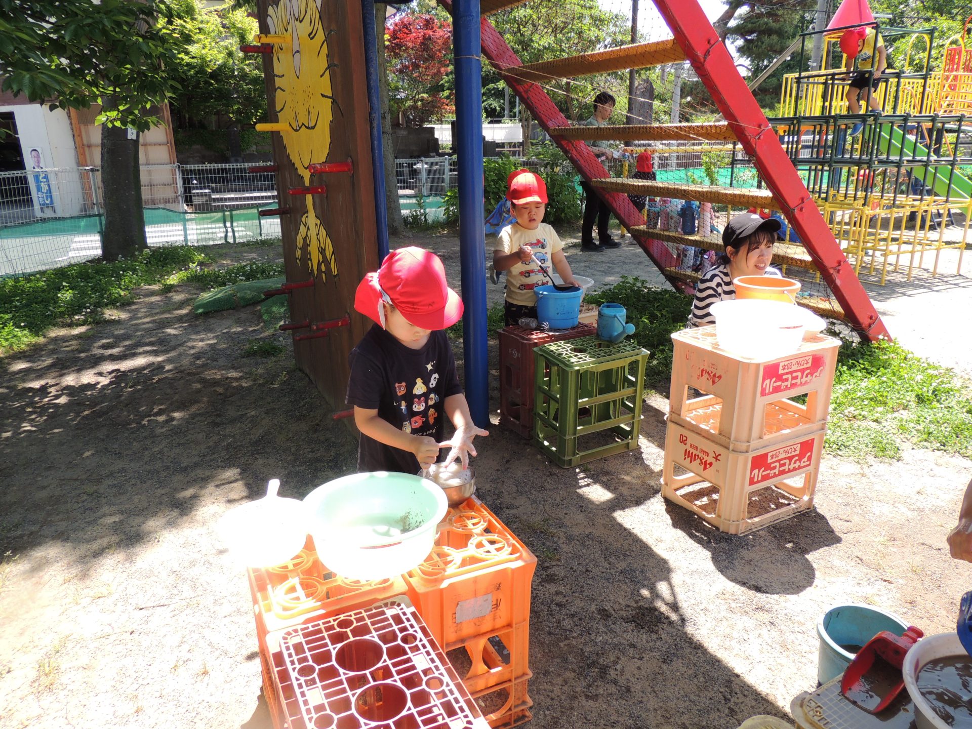 なんだか楽しそう!と人が集まり、赤い滑り台の下が4歳児のお家(拠点)になりつつあります。洗濯している人に、お料理している人に、様々な生活経験をこの場でそれぞれが遊びを通して再現しています。洗濯の泡がケーキの生クリームに変身したり、遊びながら子ども達の見立ても様々と変化しています。友達の遊びや姿に興味をもち、同じものをもったり、同じことをしながら遊びを広げている4歳児です。