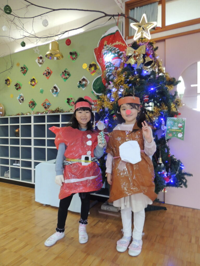 クリスマスが楽しみで、自分で衣装をつくってサンタとトナカイに変身した年長の女子2人。入園前の友達が遊びに来ることを知ると、「喜ばせた~い♡」と玄関前でウエルカムをしてくれ、制作の途中にも登場してくれました🎅✨