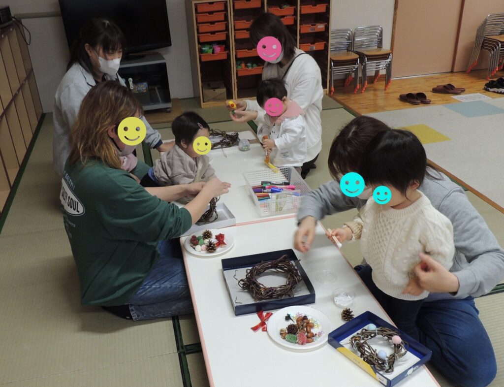 もうじきクリスマスということで、『クリスマスリースづくり』をしました🎄✨0歳児のお友達はこれは何?とボンドやペン、材料の一つ一つに興味津々👀1歳児のお友達は、自分で1つずつ材料をリースの上に飾り、世界に1つだけの私のリースを完成させました✨年齢によって、遊び方・関わり方はそれぞれですが、季節にちなんだ遊びを一緒に楽しむことができて、とっても嬉しかった私達です♡