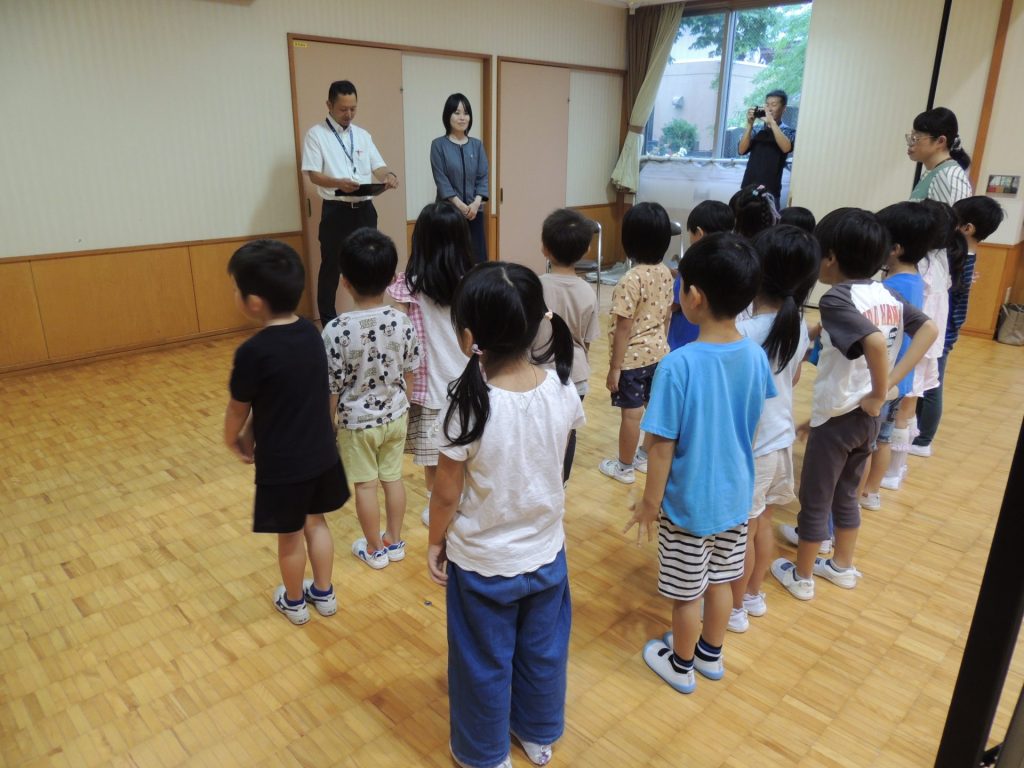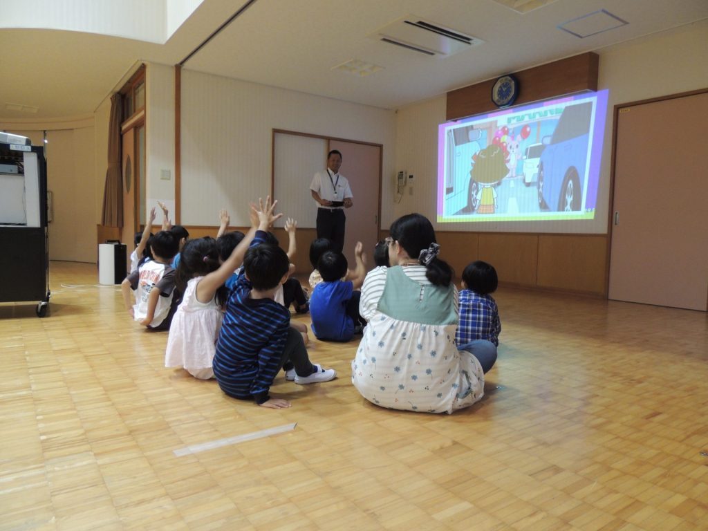 Honda Cars(ホンダカーズ)の方々に来園いただき、「できるニャン」というキャラクターが交通安全を教える「できるニャンと交通安全を学ぶ」というプログラムを実施していただきました。キャラクターの映像教材や体操などを通じて、「道路の渡り方」や「駐車場のお約束」などを学びましたよ。