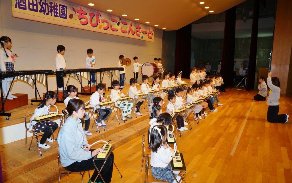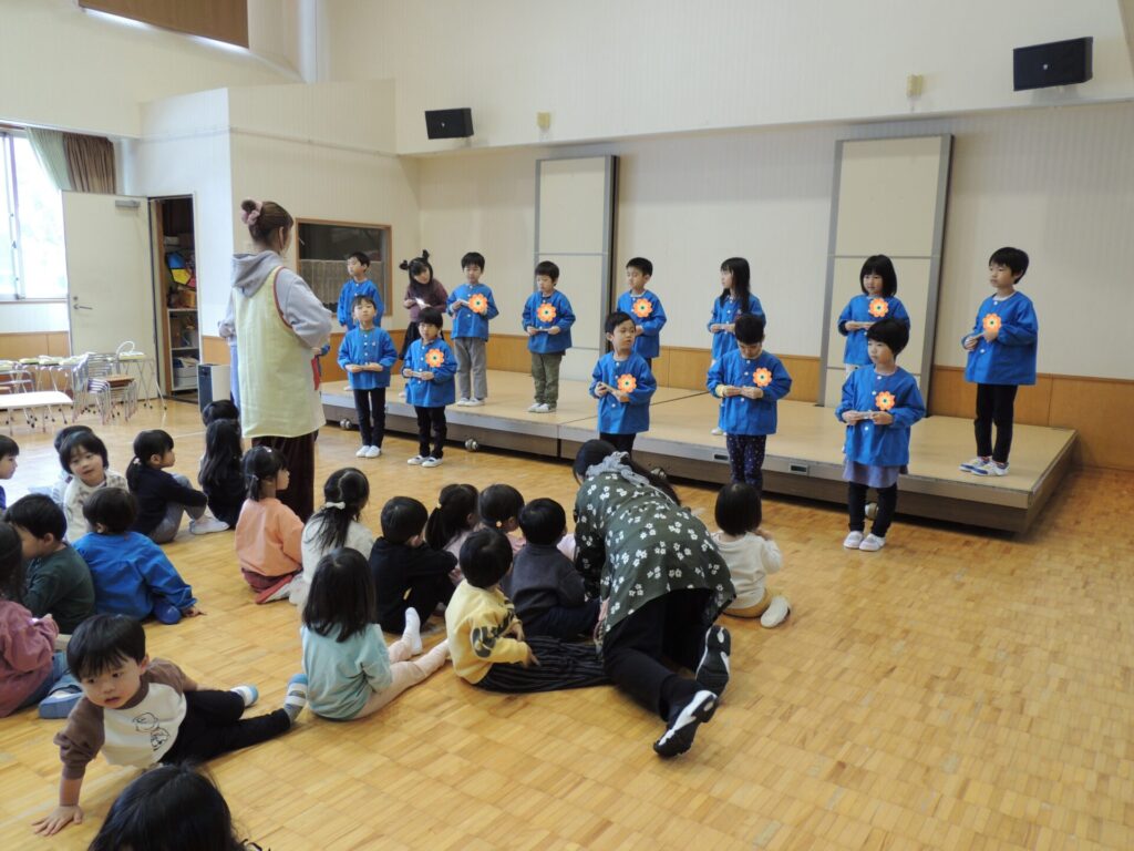 本園では特色の1つとして音楽あそび(活動)に力を入れています。子ども達が音楽あそび(活動)に「主体的」に取り組み、技術を高めるだけではなく、友達や先生と「ともに」楽しみ、そのあそび(活動)・経験の中にある「よろこび」を味わい、一人一人の子ども達が生き生きと音楽を楽しめるような関わりを大切にしてきました。当日は、大勢のお客さんを前に、ほどよい緊張感をもちながらも、普段通りの音楽を楽しむ姿を見てもらうことができたと思います☻