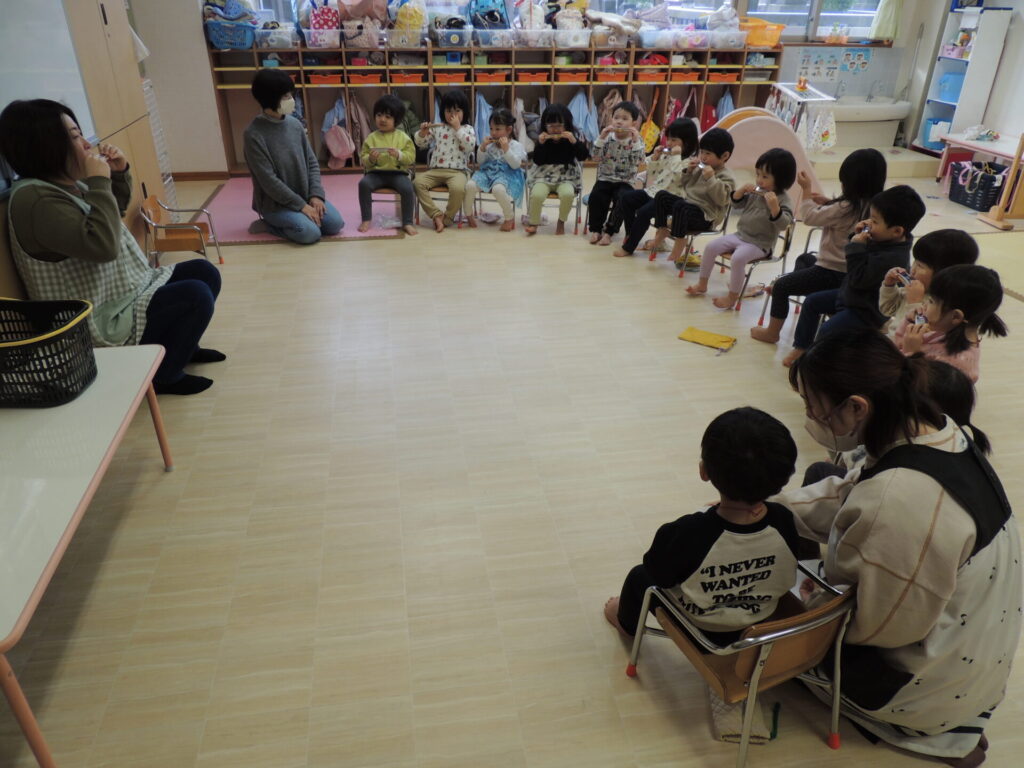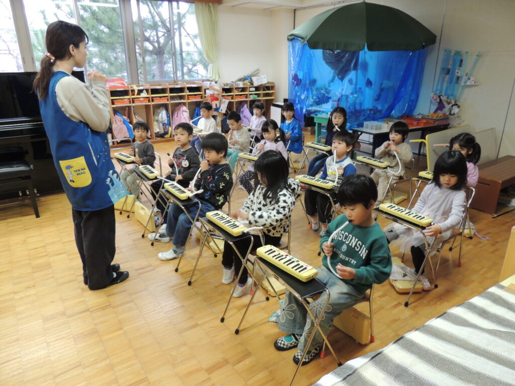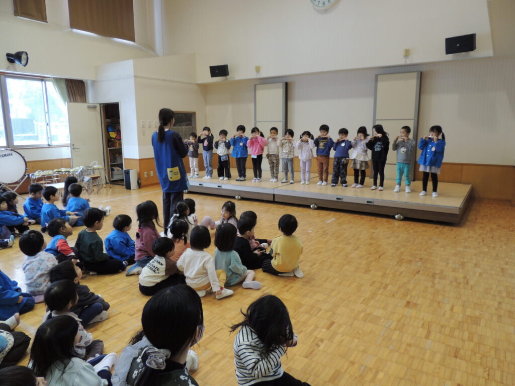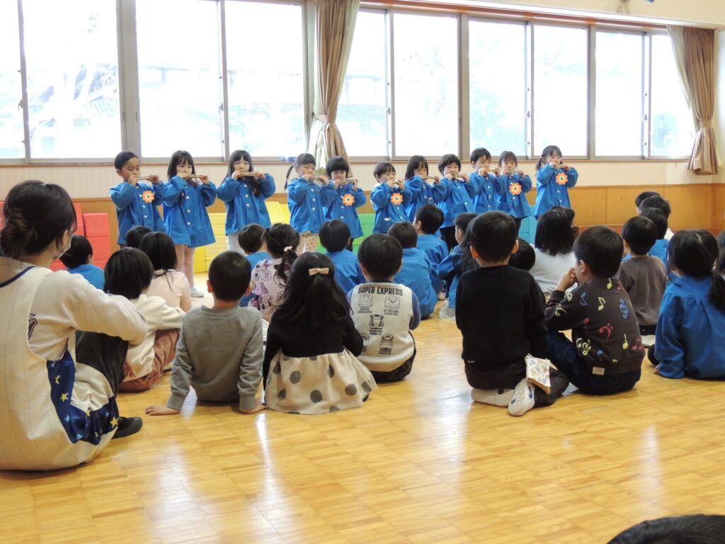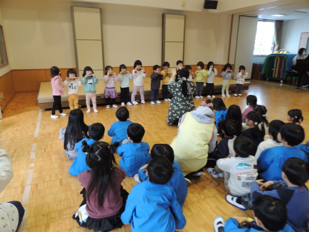 2学期後半ぐらいからは、クラスのみんなで楽しんだり、レインボーひろば(園全体集会)で学年毎に発表し合ったりもしました。他の学年の演奏を見ると、更にやる気が高まる子ども達でした👀✨