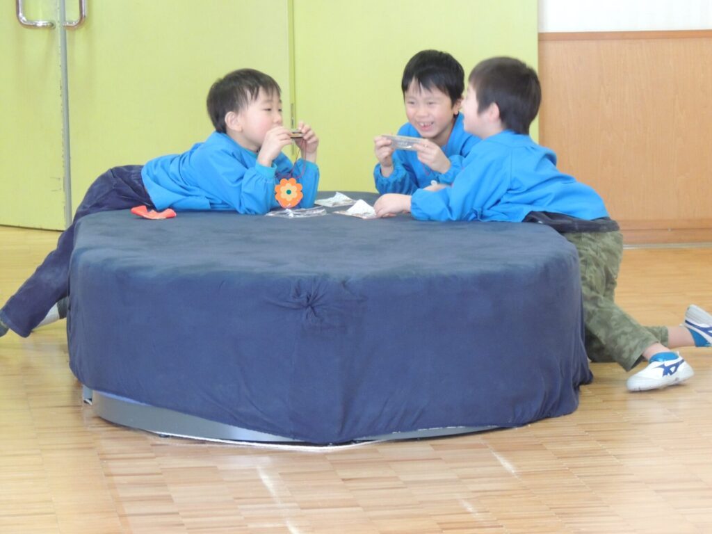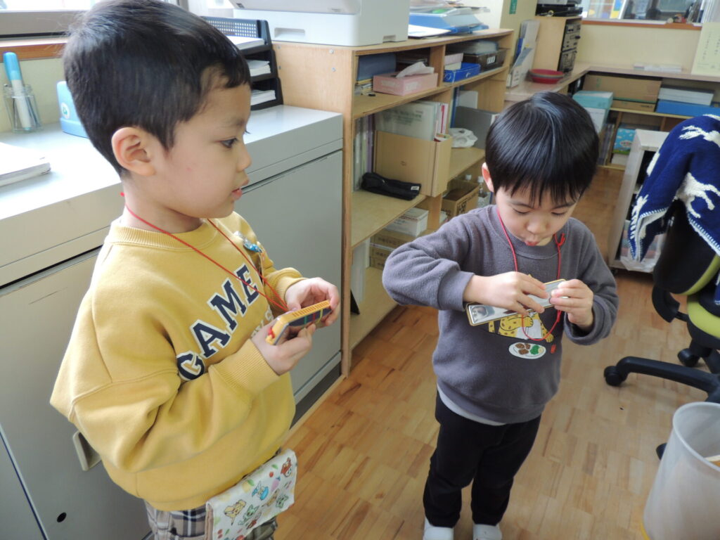 過程はこんな感じでした☻友達と一緒にハーモニカを吹いたり、先生に聞いてもらいに出かけたり、自由に吹くことを繰り返し楽しんできました。いつでも自由に取り出し、好きな場所で演奏して楽しみました。自分で音を探して演奏できるようになった曲を「〇〇のピアノ教室」と名付けて、友達と教え合う様子もありました。