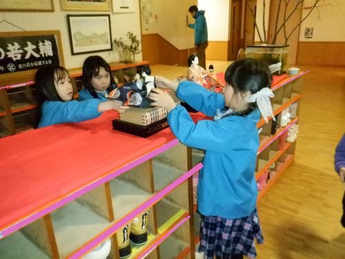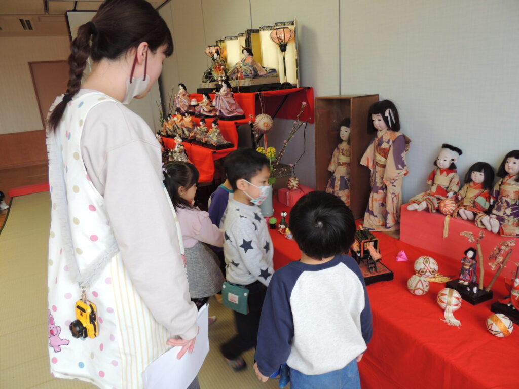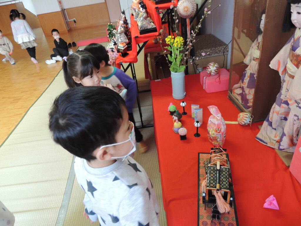 飾られた雛人形を、他の学年の子ども達が見にきます👀