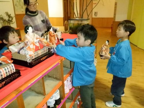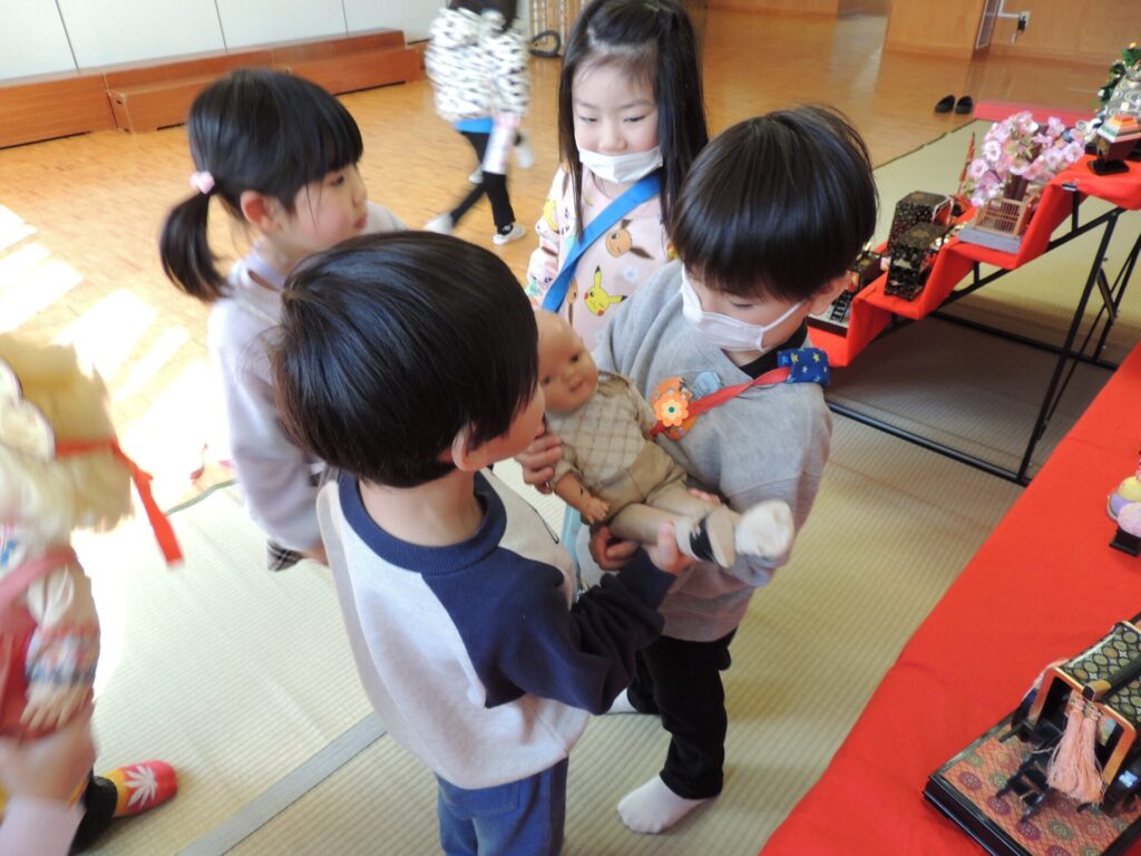 本園には昔ながらの雛人形、その他人形も飾られていますが、子ども達は怖がることなく興味をもって触れています。