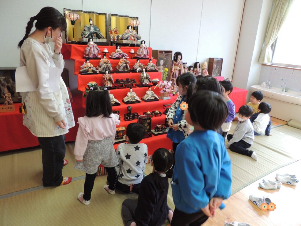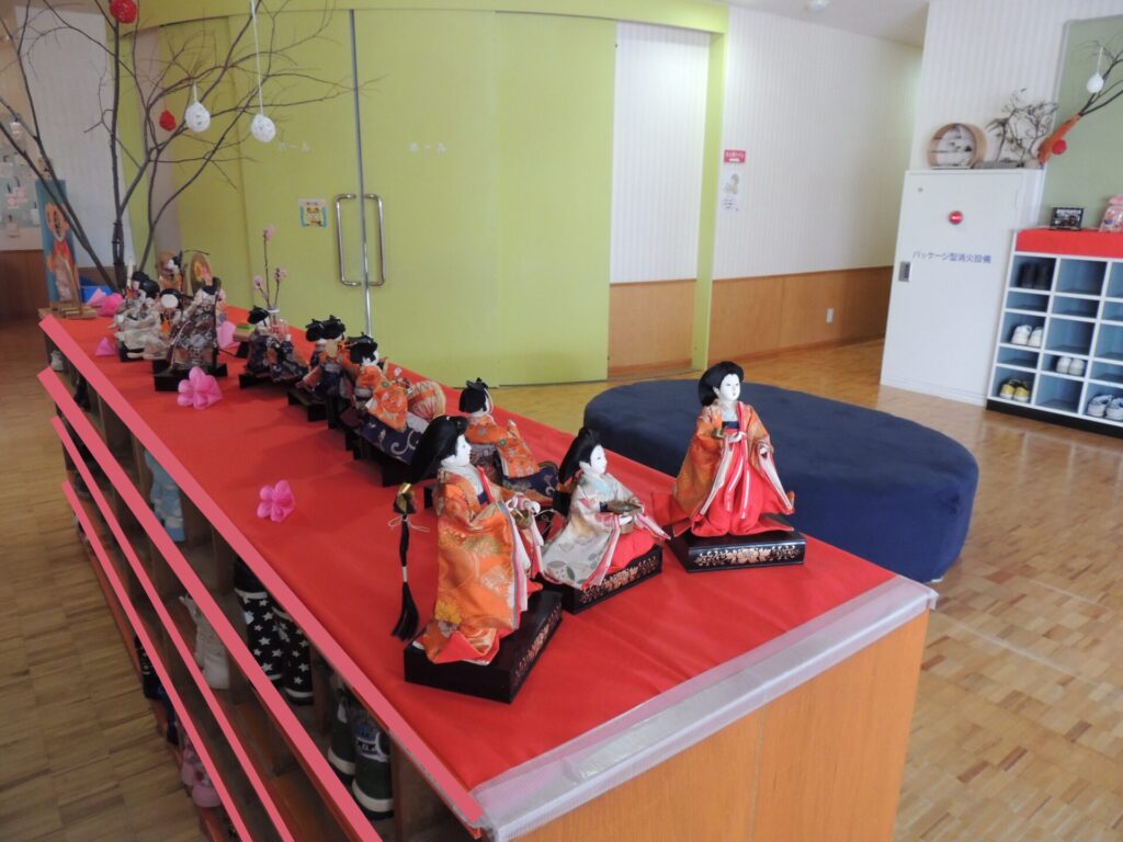 3月3日は桃の節句。雛祭りです。園内にも雛人形が飾られました。今年は、七段飾りの雛人形が加わり、一層華やかで賑やかな雰囲気となりました✨