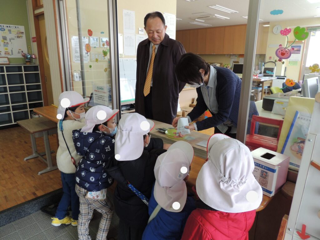 「ただいま~」と園に戻った後は事務さんにお釣りを渡します。「合っているかな…」と少しドキドキしながら計算する様子を見つめる子ども達。「オッケ~✨」の声を聞くと、「やった!」と嬉しそうな表情に。無事にお買い物を終えることができました。